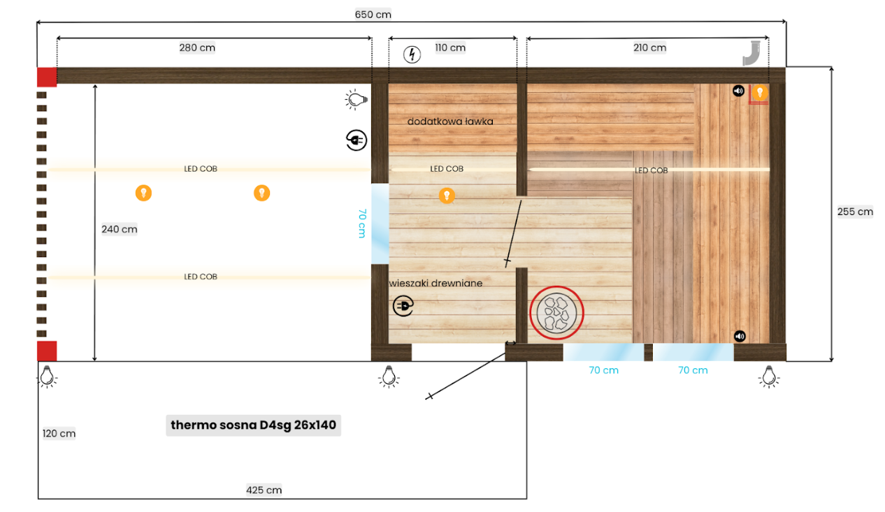 Standardowo wyposażona jest w mocny piec Harvia, nastrojowe oświetlenie LED oraz system audio, który pozwala w pełni zanurzyć się w atmosferze relaksu. W wersji premium oferujemy także piece marki Huum, które zachwycają nowoczesnym designem i zapewniają wyjątkowe doznania podczas kąpieli w saunie suchej – dłużej utrzymujące się ciepło, równomierne nagrzewanie i charakterystyczny, łagodny klimat. Duże przeszklenia sprawiają, że wnętrze jest jasne i nowoczesne, a widok ogrodu staje się integralną częścią saunowania. ALTA posiada również otwartą część tarasową – to przestrzeń, w której klienci najczęściej stawiają jacuzzi, albo urządzają ją jako miejsce wypoczynkowe z leżakami, tworząc prywatną strefę relaksu na świeżym powietrzu.